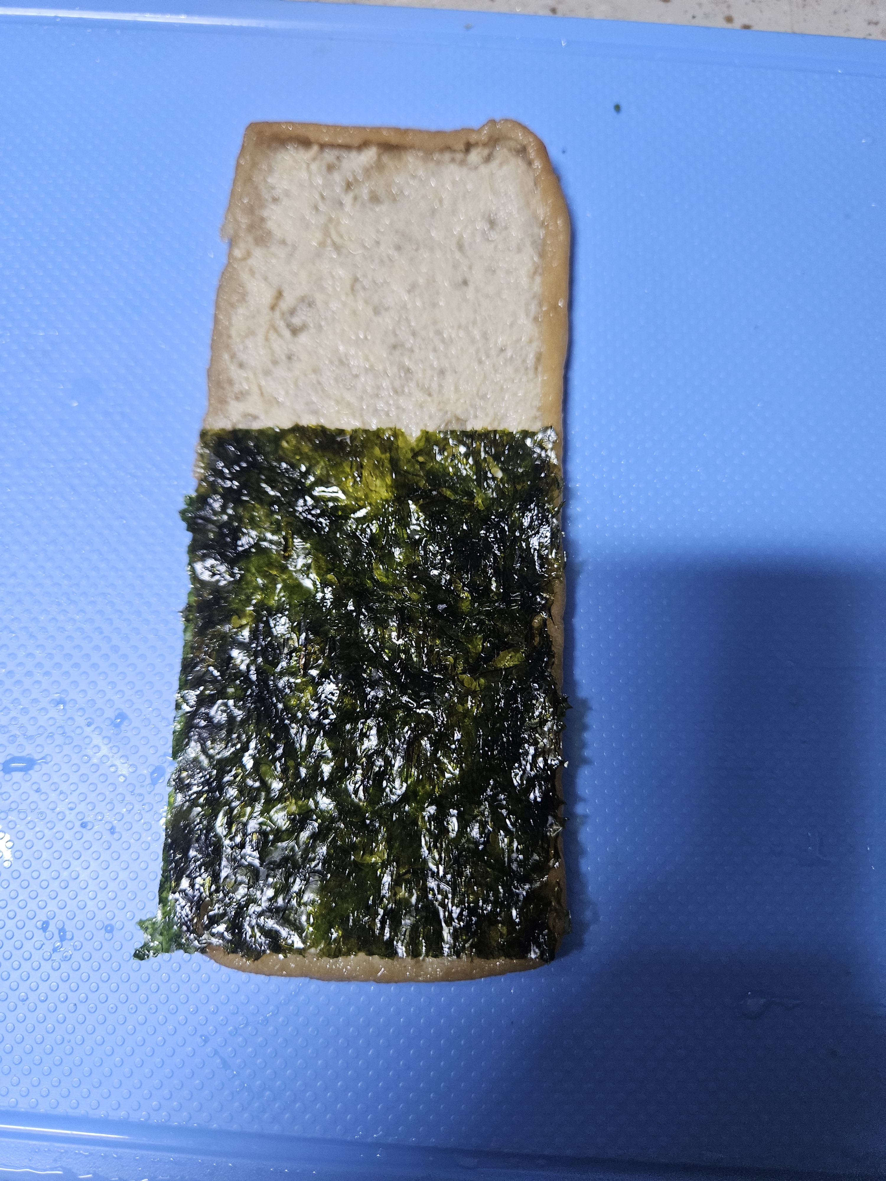 2. 유부를 펼치고 그 위에 김을 깔아요.