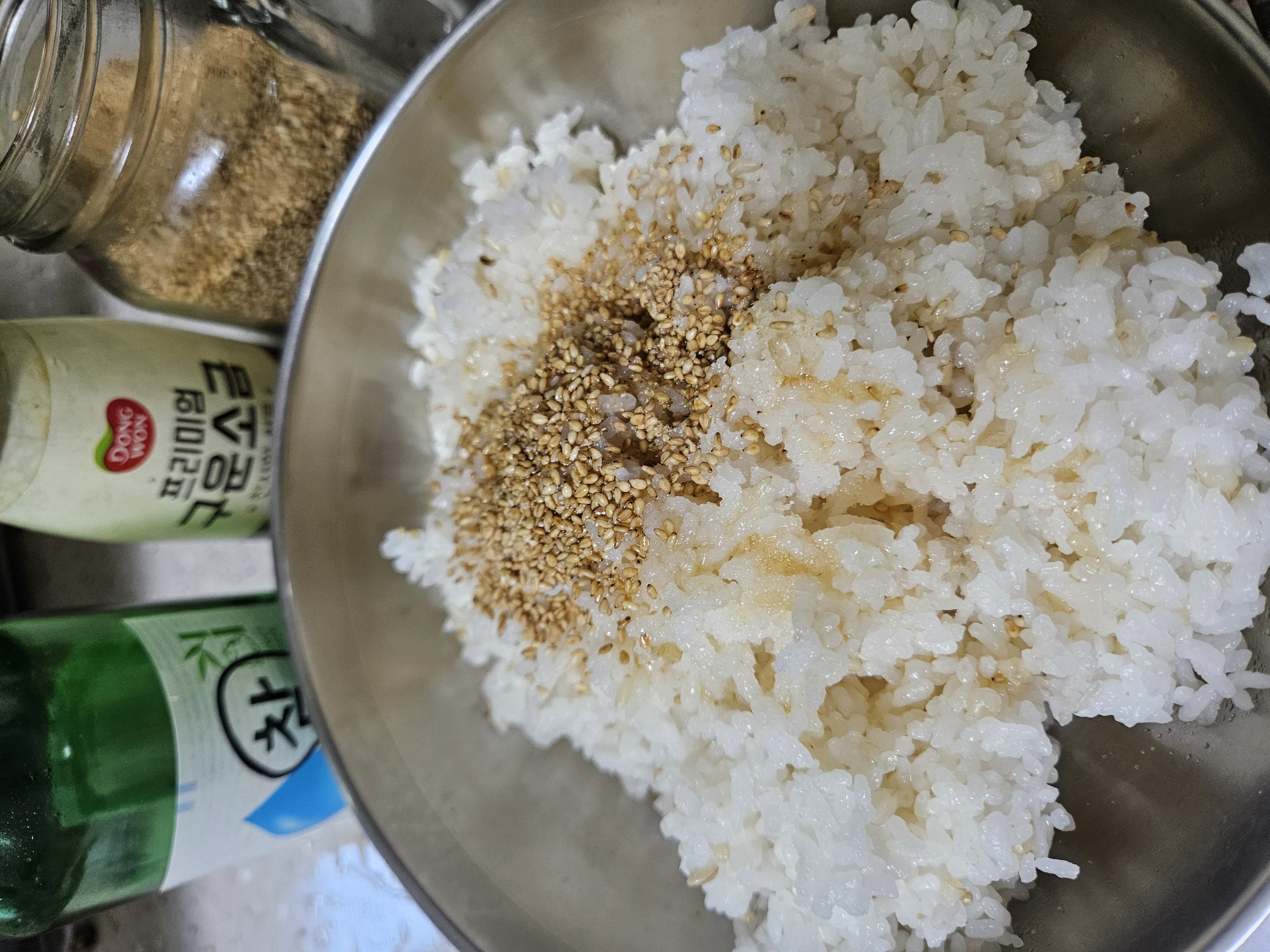 먼저 밥에 국산 참기름과 볶은 참깨, 구운 소금을 살짝 넣고 고루 섞어주세요.