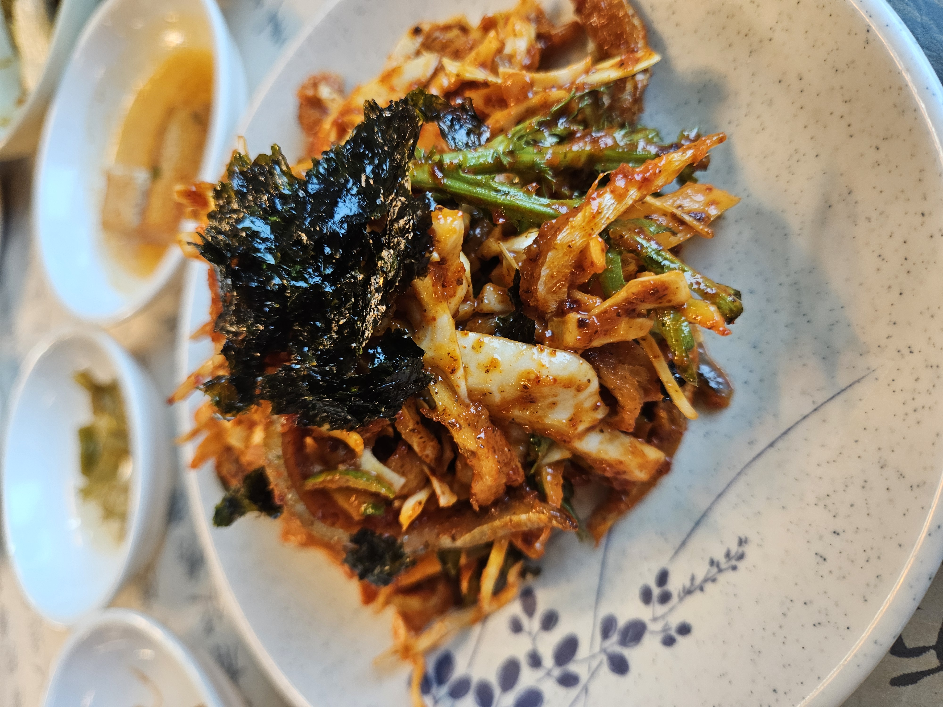 다음은 밴댕이무침. 매콤한 양념에 싱싱한 채소와 밴댕이가 버무려져 나왔는데, 김가루까지 올려져 감칠맛 폭발! 매콤한 맛에 젓가락이 멈추질 않더라고요. 맥주가 술술 넘어가네요~